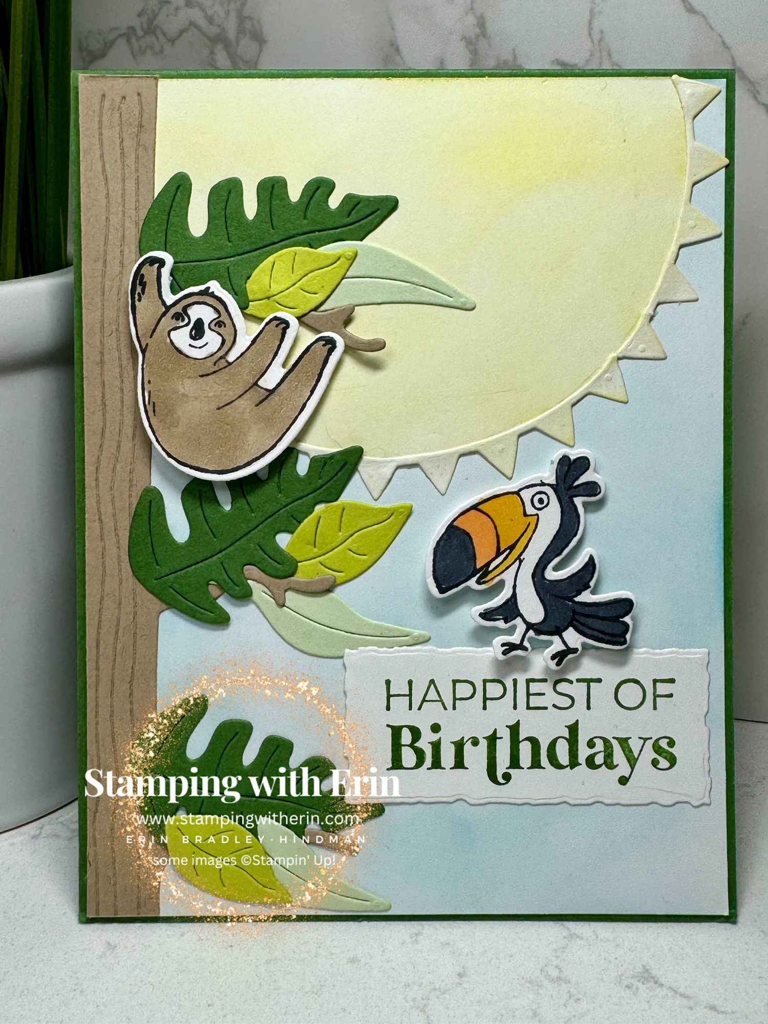 I stamped the Toucan and the Sloth with Memento ink and then colored with Blends. I used Crumb Cake on the sloth, and Daffodil, Pumpkin and Black on the Toucan.