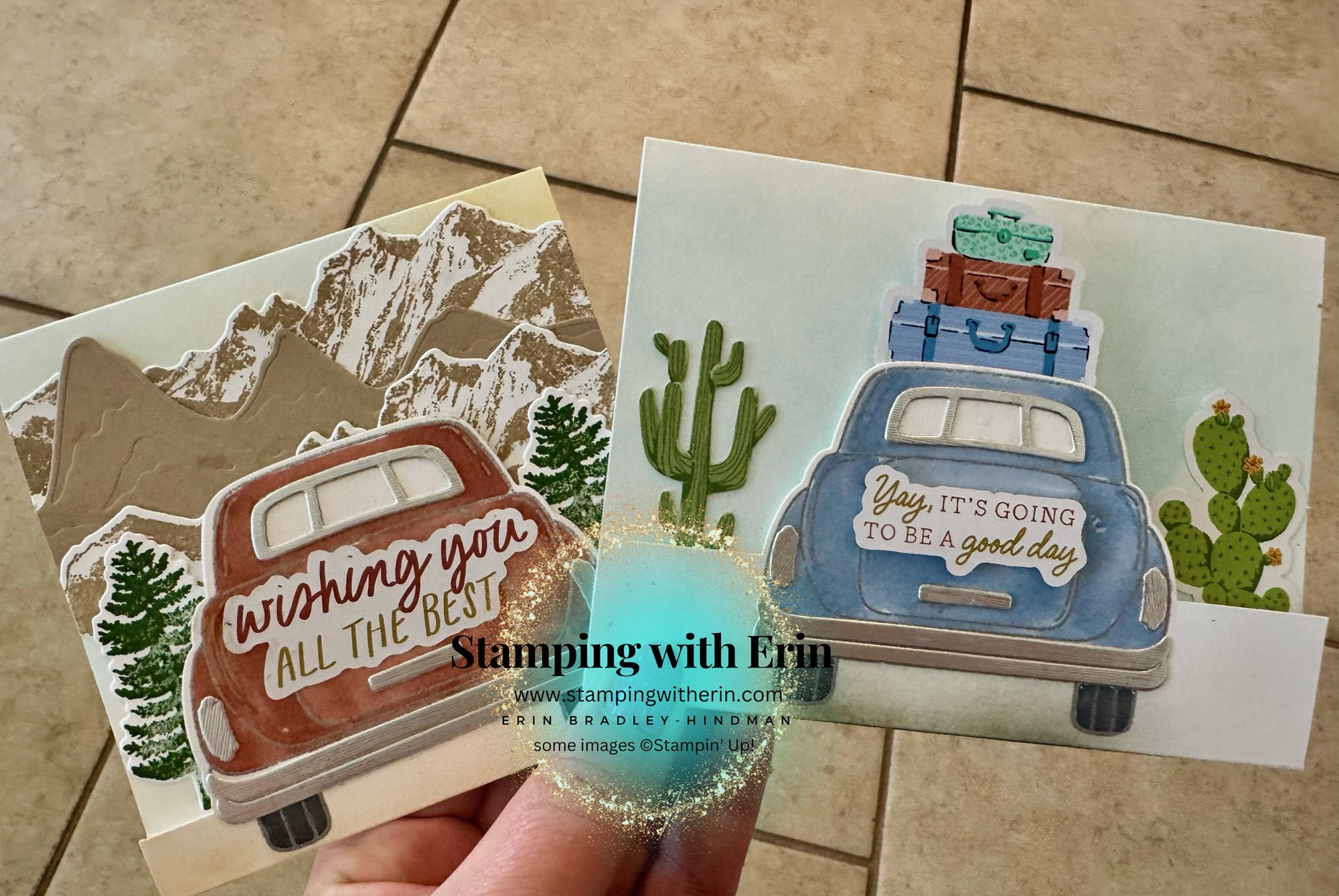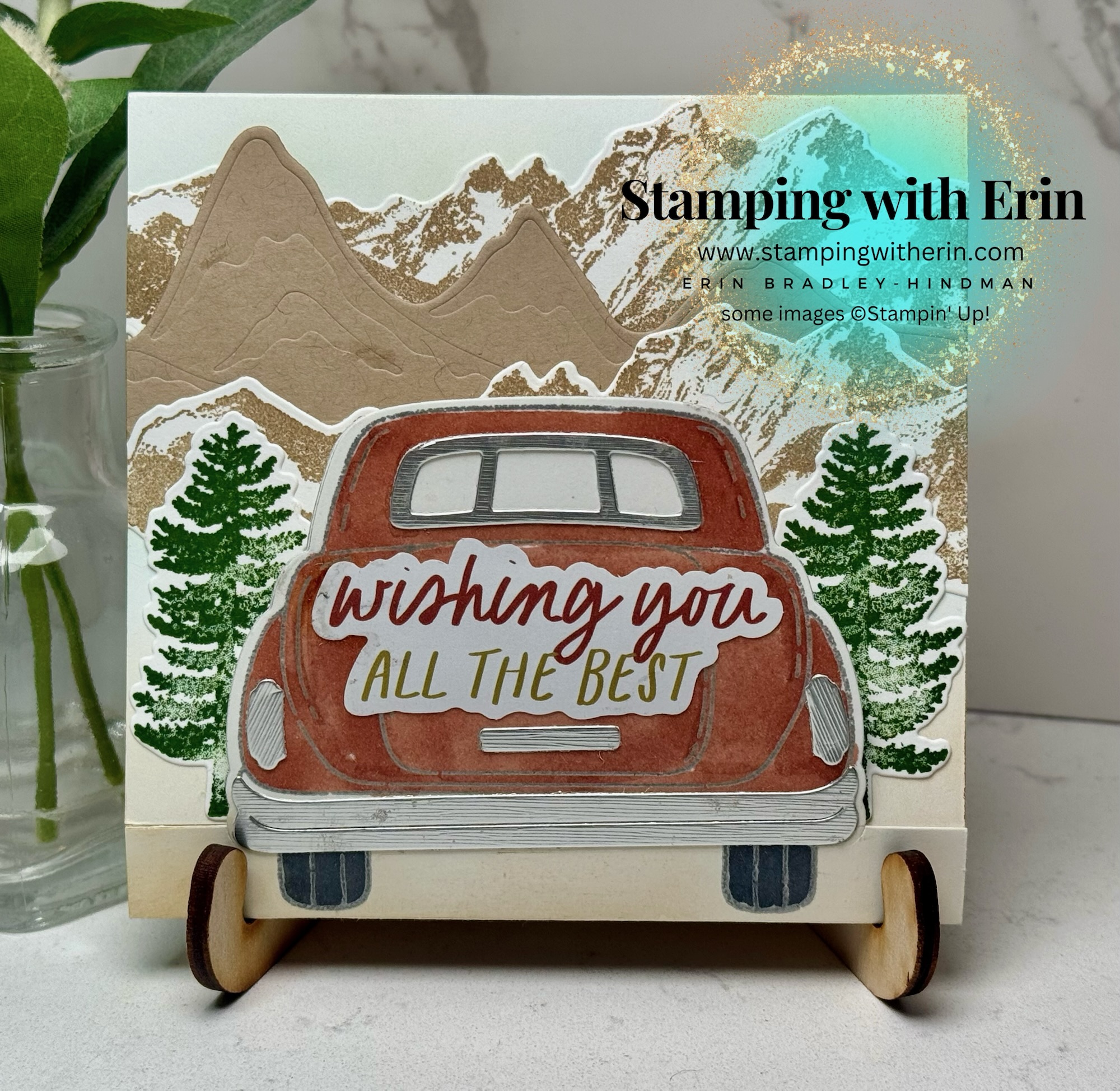 This one has a ton of retired products. The trees and the Crumb Cake mountain is Forever Forest, which is gone. I do have one on eBay! The other mountains are the In the Grove stamps and dies. Right now, only the dies are available. I will put mine on eBay when the dies are sold out. But, you may have other stamps and dies that are trees and mountains so you could make a card that looks very similar.