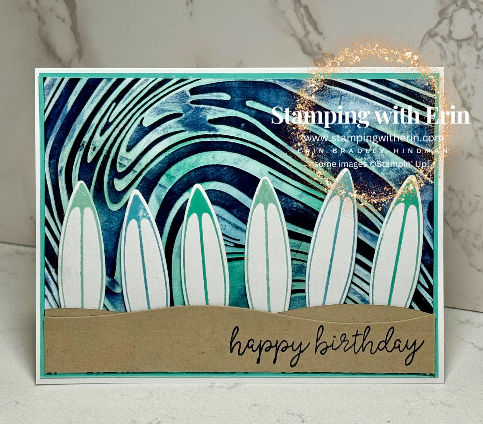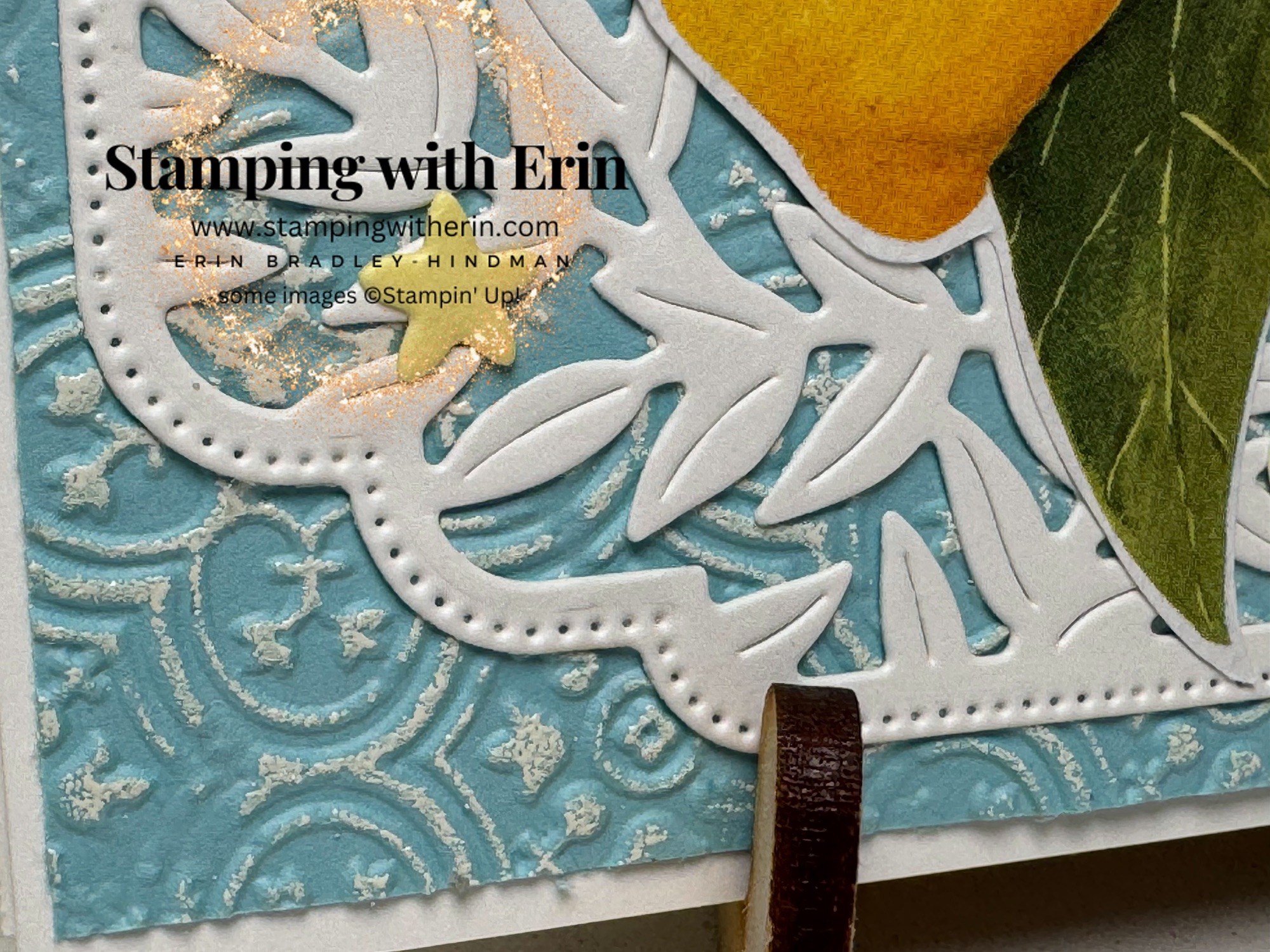For the background, I used Azure Afternoon, Pool Party and Coastal Cabana. After the tissue paper had dried, I cut it to 4″ x 5/4″ and embossed with the Seaside Wishes embossing folder.
