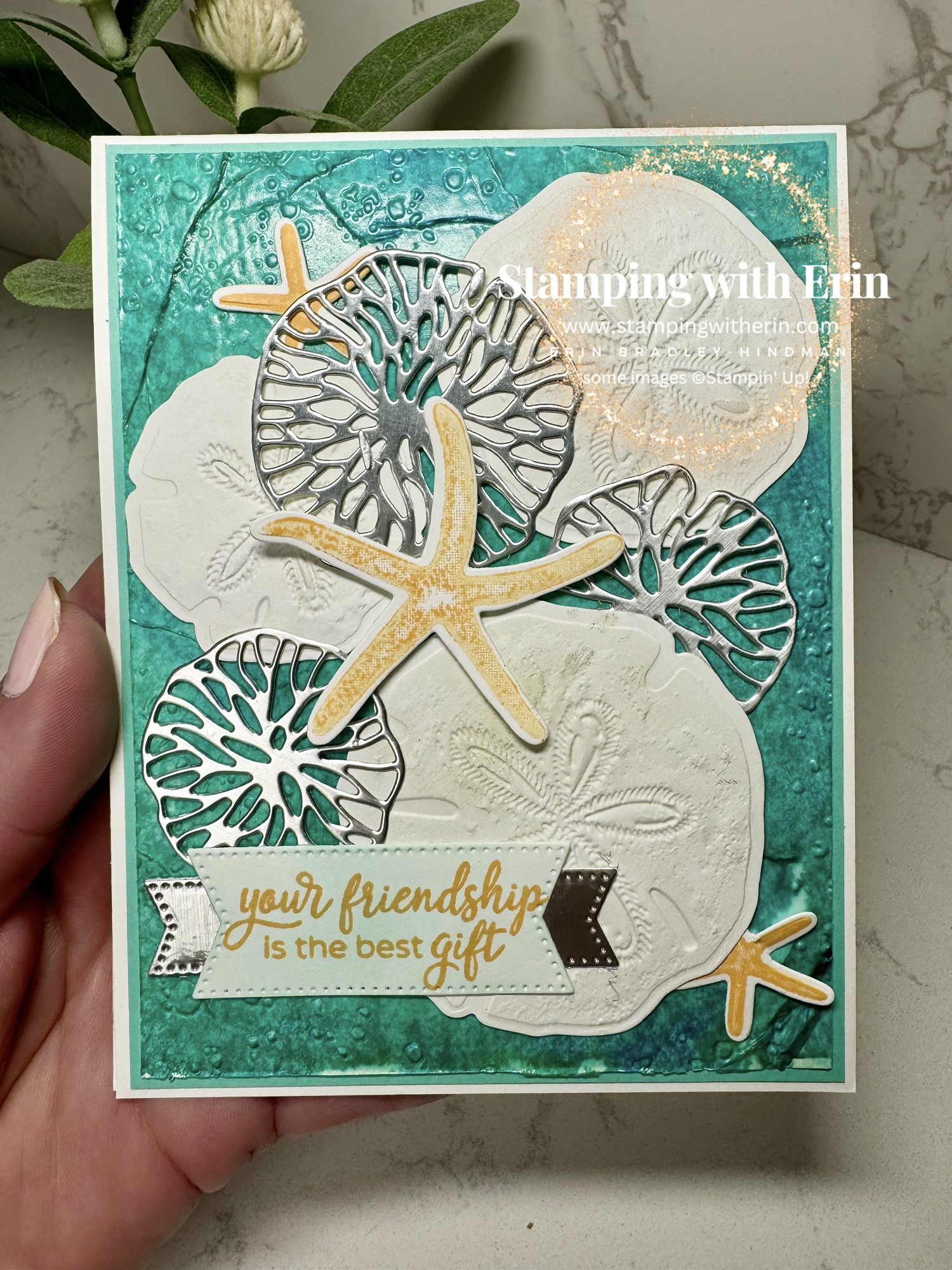 I die cut and embossed the sand dollars with Basic White paper. Using a Blending Brush, I colored them with Basic Beige.
