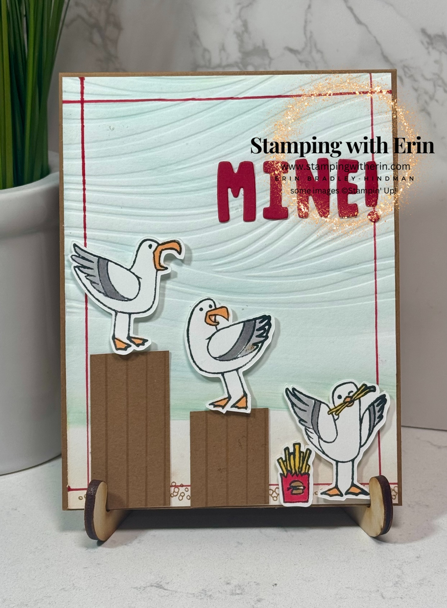 I stamped all the seagulls and the fries with Memento and colored with Smoky Slate, Pumpkin Pie, Real Red and Daffodil Delight Blends. I fussy cut them.