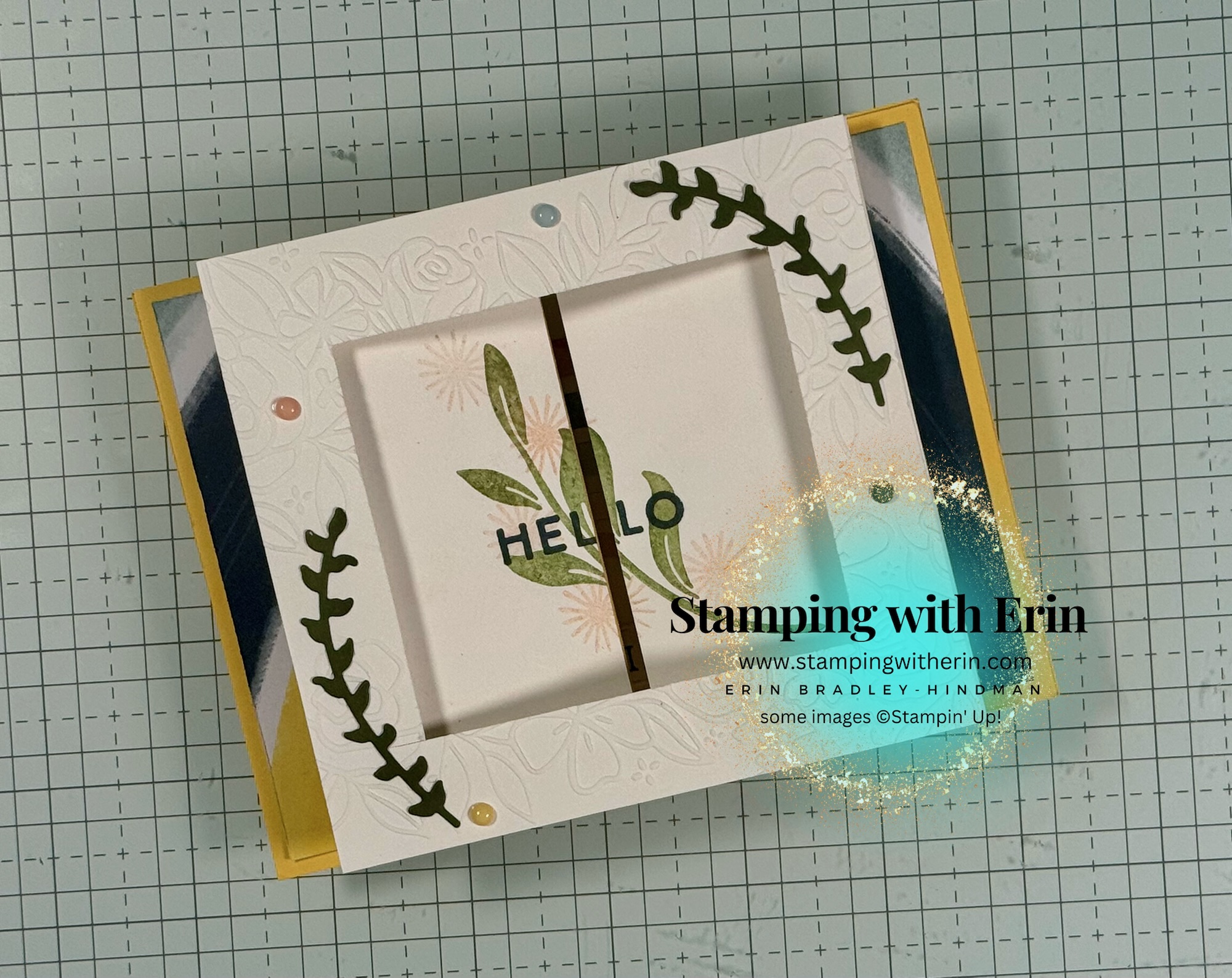 I stamped the paint edge on the bottom of the Basic White to match the paint brushes. Crushed Curry and Lost Lagoon. I then embossed the paper with the Painted Texture folder.